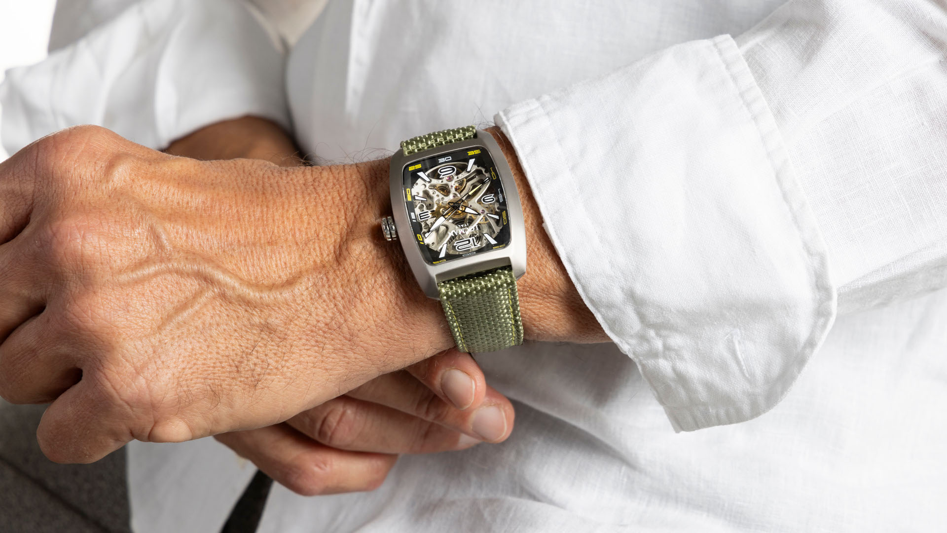 La cassa รจ realizzata in titanio, materiale leggero, resistente, durevole e completamente riciclabile, in perfetta sintonia con il rispetto per lโambiente. ร disponibile anche con trattamento PVD Black, che conferisce un look deciso e contemporaneo. Lโimpermeabilitร รจ garantita fino a 20 atmosfere.
